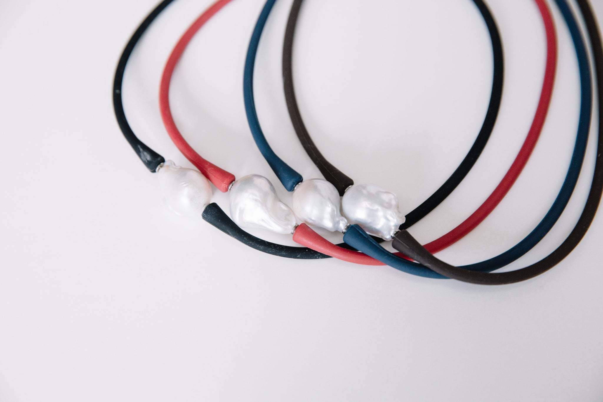 Rubber and fine inception pearl, beware, it’s addictive! All ages love this piece! Available in red, navy, bright Grizzlies blue, black, brown, cream, and grey blue! please specify your color choice. Can be worn 15-17 inch...by tying a love knot in back of rubber cord or simply untying for longer version;)